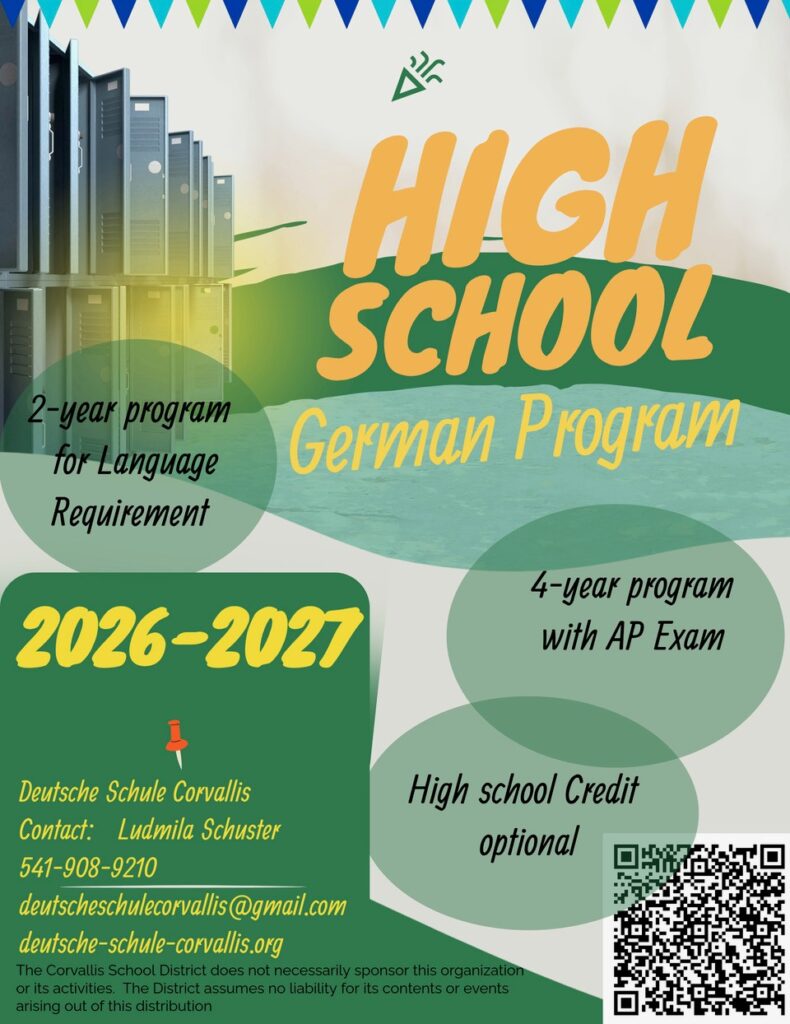 Deutsche Schule Corvallis offers hybrid-style classes for high school and 8th grade students in our area.